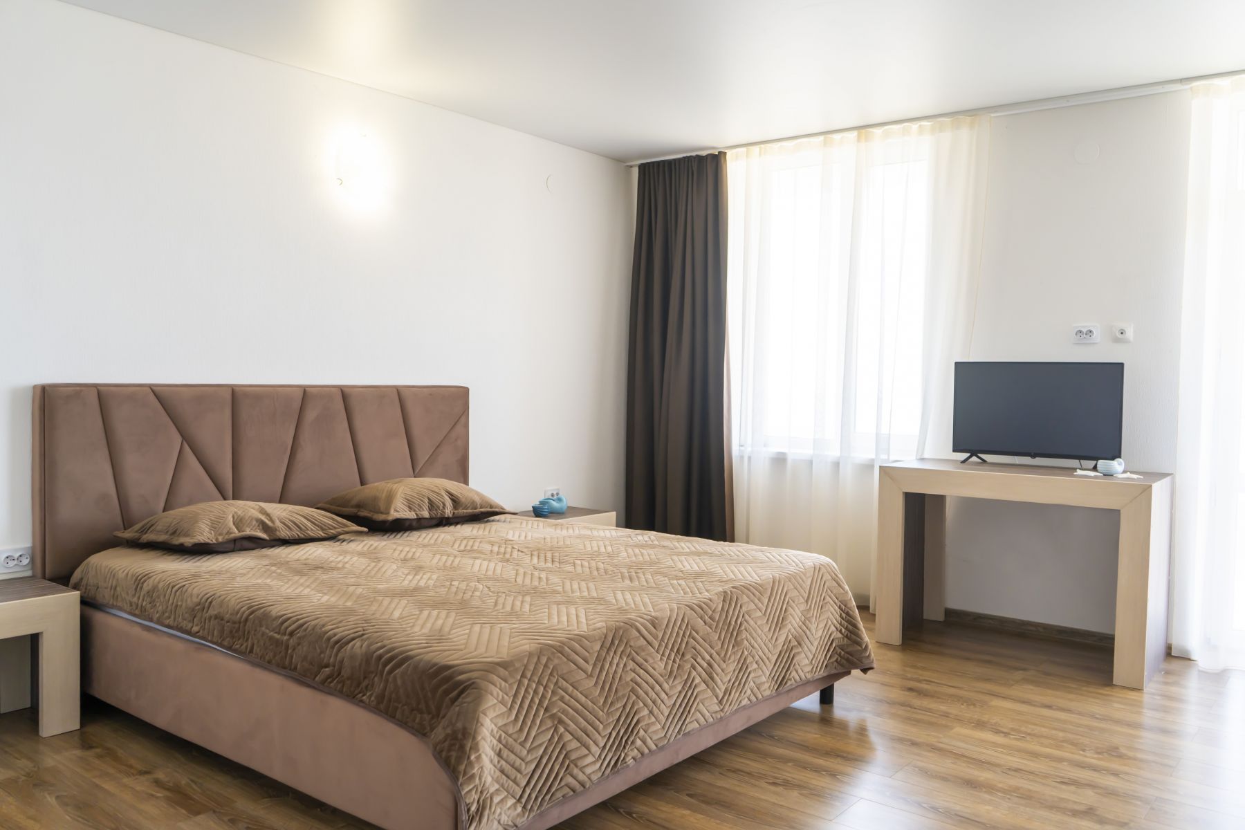 Площадь семейного номера 70 м2. Номер расчитан на 6-10 человек. Состоит из четырех комнат, отдельный сануел, душ. Оснащен: 2 двуспальные кровати (King size), два раскладных дивана, и две полуторных кровати, шкафы, 3 письменных стола, обеденный стол со стульями, холодильник, микровалновая печ. индукционная плита, кофемашина, посуда, 3 плоских ЖК телевизора диагональ 40 дюймов, чайник, сплит системы, бесплатный.