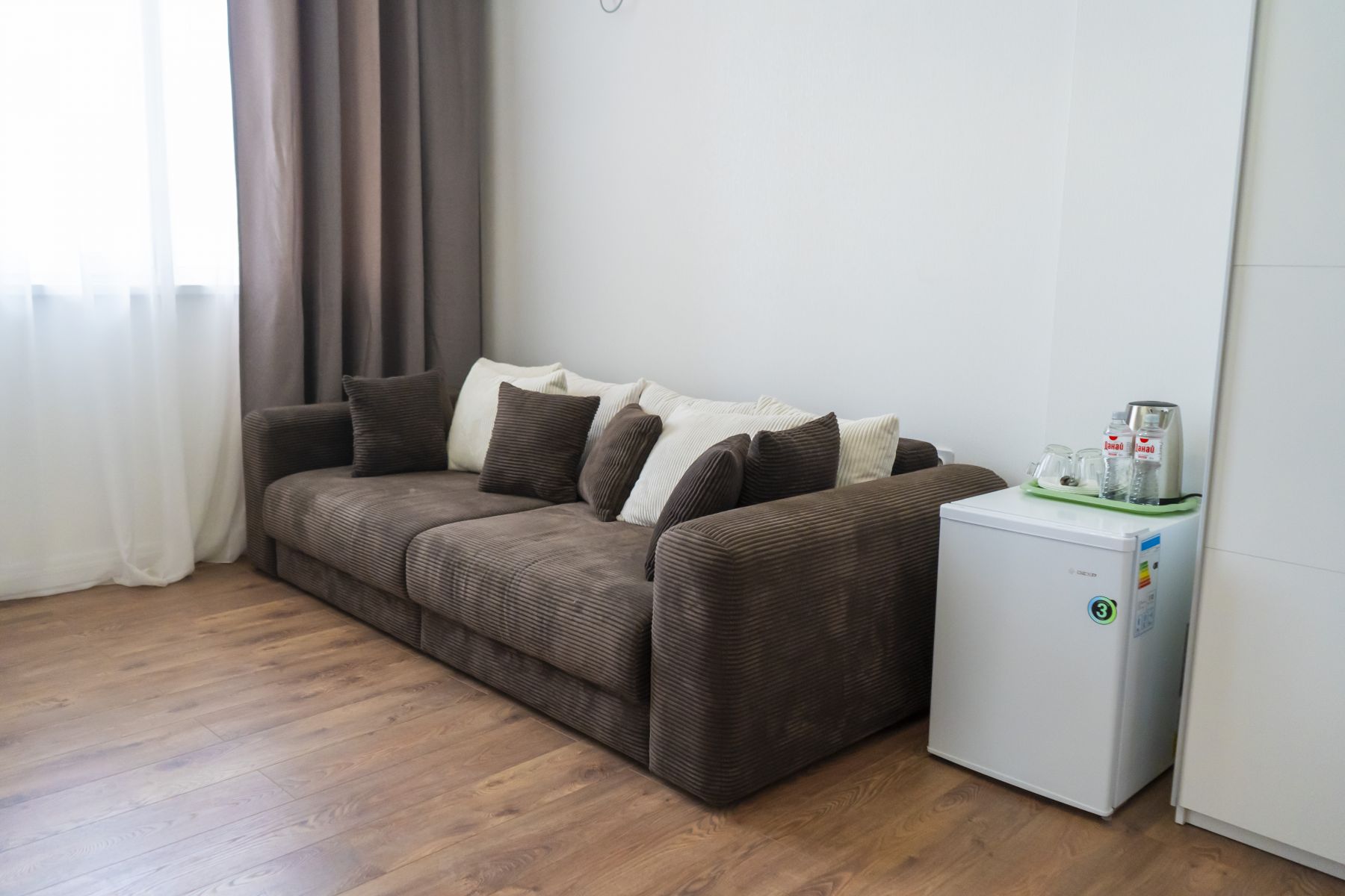 Площадь семейного номера 50 м2. Номер расчитан на 3-4 человек. Состоит из двух комнат, отдельный сануел, душ, Оснащен: 2 двуспальные кровати (King size), шкаф, письменный стол, обеденный стол со стульями, холодильник, плоский ЖК телевизор диагональ 40 дюймов, чайник, сплит система, бесплатный интернет.