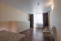 Площадь семейного номера 40 м2. Номер расчитан на 3-4 человек. Состоит из двух комнат, по одной комнате на каждом этаже, отдельный сануел с душевой кабиной. Оснащен: 1 двуспальная кровать (King size), диван на два спальных места, шкаф, письменный стол, обеденный стол со стульями, холодильник, плоский ЖК телевизор диагональ 40 дюймов, чайник, сплит система, бесплатный интернет.