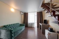 Площадь семейного номера 40 м2. Номер расчитан на 3-4 человек. Состоит из двух комнат, по одной комнате на каждом этаже, отдельный сануел с душевой кабиной. Оснащен: 1 двуспальная кровать (King size), диван на два спальных места, шкаф, письменный стол, обеденный стол со стульями, холодильник, плоский ЖК телевизор диагональ 40 дюймов, чайник, сплит система, бесплатный интернет.