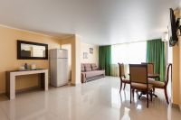 Площадь семейных номеров 40-47 м2. С большой терассой. Номер расчитан на 3 человек с возможностью при необходимости поставить дополнительное место за оплату по тарифу . Во всех номерах есть санузел, душ, двуспальная кровать (King size), вешалка, шкаф, раскладывающийся диван, письменный стол, чайный столик со стульями, холодильник, комплект полотенец, телевизор диагональ 40 дюймов, чайник, сплит система, бесплатный интернет.