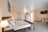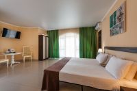 Площадь номеров Полулюкс 27 м2. С большой террасой 20м2. Номер рассчитан на 2 человек. Во всех номерах есть санузел, душ, двуспальная кровать, вешалка, письменный стол, чайный столик со стульями, холодильник, плоский ЖК-телевизор диагональ 40 дюймов, чайник, сплит система, бесплатный интернет. Также в стоимость номера входит: детская площадка, детская игровая комната с аниматорами, зона барбекю, охраняемая автостоянка, шезлонги.