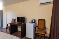 Во всех номерах есть санузел, душ, двуспальная кровать, вешалка, письменный стол, чайный столик со стульями, холодильник, Плоский ЖК Телевизор диагональ 30 дюймов, чайник, сплит система, бесплатный интернет.