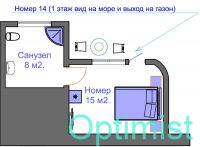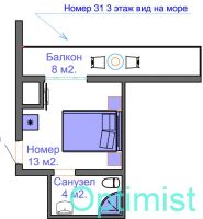 Стандарт с балконом. Номер расчитан на 2 человек. Во всех номерах есть санузел, душ, двуспальная кровать, вешалка, письменный стол, чайный столик со стульями, холодильник, плоский ЖК-телевизор диагональю 30 дюймов, чайник, сплит система, бесплатный интернет. Также в стоимость номера входит: детская площадка, детская игровая комната с аниматорами, зона барбекю, охраняемая автостоянка, шезлонги.
